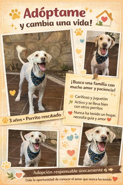 🐾 ¡Adopta y transforma una vida! 🐾 Este perrito fue rescatado y ahora busca una familia llena de amor y paciencia 💛. Tiene aproximadamente 3 años, está sano y listo para encontrar un hogar. Es muy cariñoso, juguetón y activo. Se lleva bien con otros perros y no muestra agresividad. Solo necesita orientación y la oportunidad de aprender lo que significa tener una familia 🏡✨ 📌 Adopción responsable únicamente 📌 Hogar con amor, compromiso y estabilidad Dale la oportunidad de conocer el amor que nunca ha tenido ❤️ ¡Ayúdame a compartir! No puedo resguardarlo por mucho más tiempo 🙏