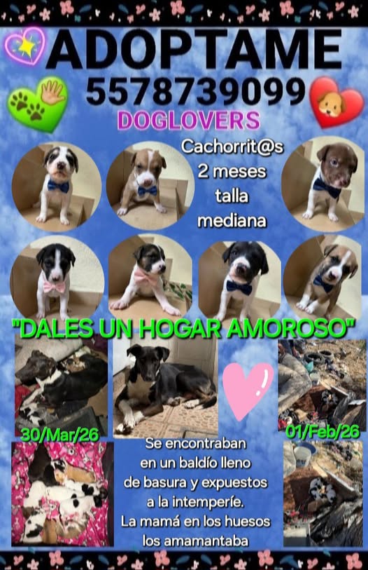 ADOPTA Y NO COMPRES (DOGLOVERS TECÁMAC) DALE LA OPORTUNIDAD DE CONOCER EL AMOR DE UNA FAMILIA. Estos 10 cachorritos (tenían 1 semana y ahora tienen 2 meses, desde el 31 de marzo de 2026) y su madre (talla grande, 2 años) fueron rescatados de un terreno baldío lleno de basura e insectos. La madre estaba muy delgada y amamantaba a sus cachorros. Liz y su hijo los rescataron y les brindaron un hogar temporal. A uno de ellos le dieron biberón. ¡Dios los bendiga y provea! 🙏🏼