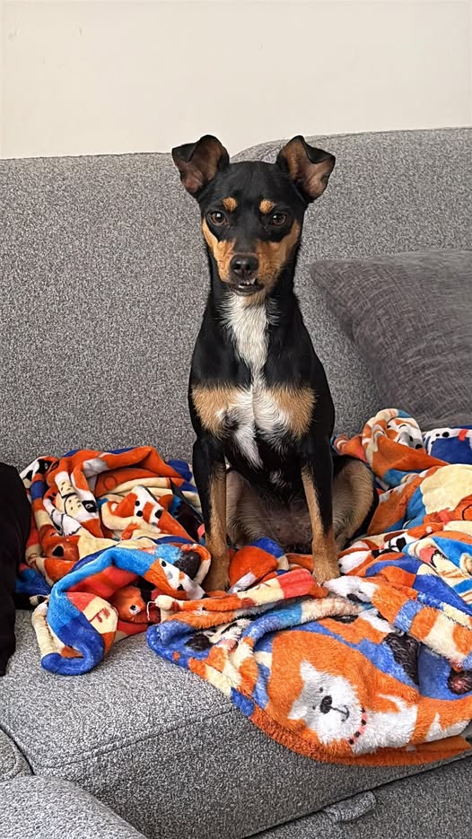 En adopción: No hemos podido localizar a sus dueños, por lo que lamentablemente no podemos quedarnos con ella. Es una perrita muy noble, juguetona, cariñosa y sociable. Tiene aproximadamente 1 año y parece ser una mezcla de Pinscher y Chihuahua.