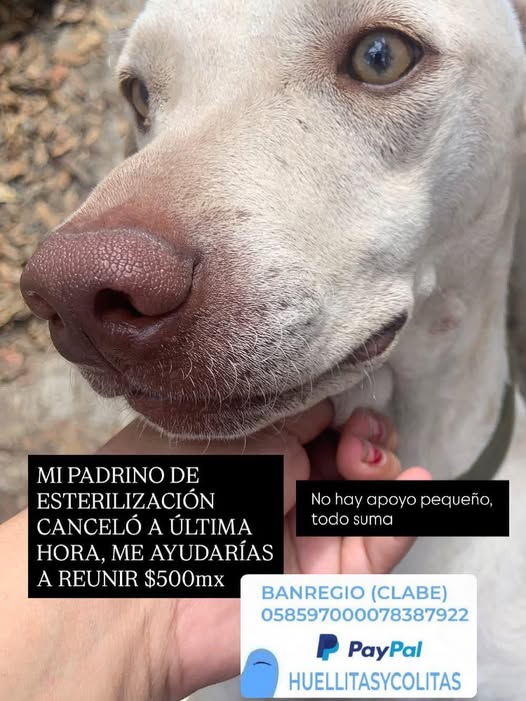 Estamos buscando ayuda para un hermoso perro que hoy necesita de nosotros. Su padrino tuvo que cancelar y actualmente está en ayunas esperando atención. 🥺 ¿Nos pueden ayudar? Cualquier contribución, por pequeña que sea, nos acerca un poco más a brindarle el apoyo que necesita. Agradecemos de corazón cualquier ayuda. ✨ Transferencia 💌🐾 R. Maria Huellitas Clabe Banregio: 058597000078387922 PayPal: paypal.me/huellitasycolitas WhatsApp: wa.me/529844273746