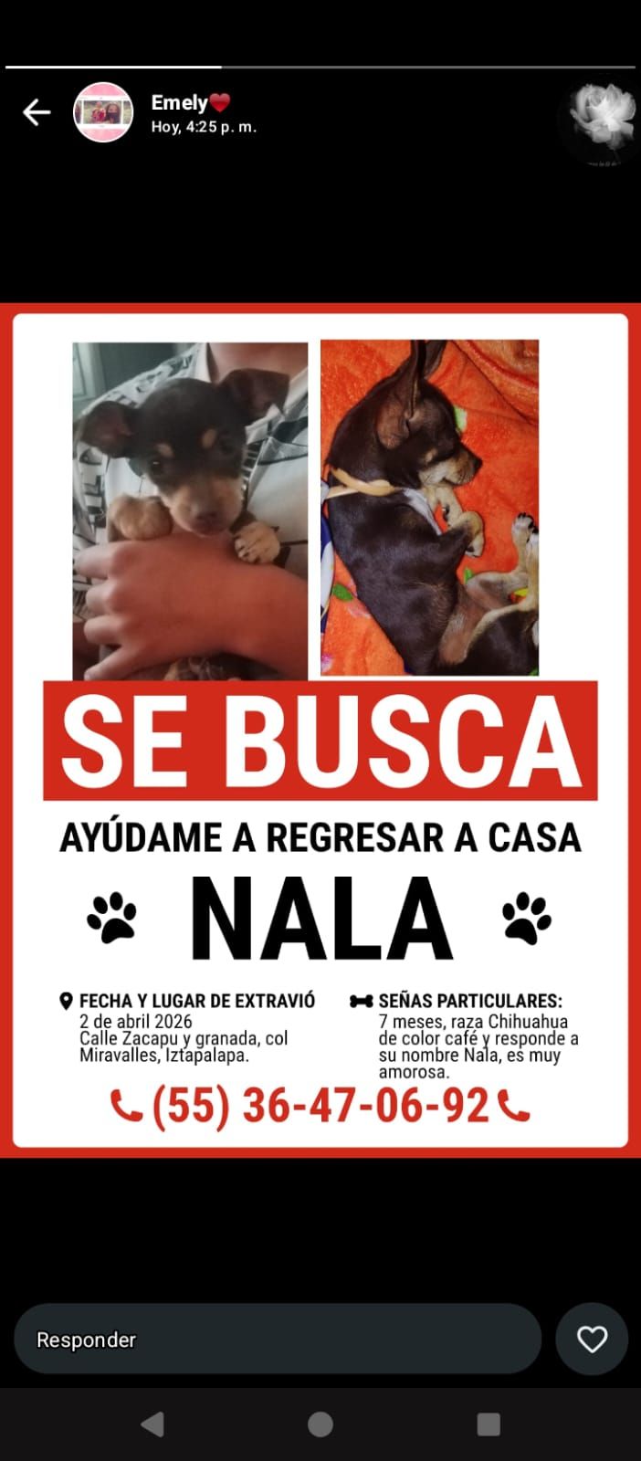 LostNalaChihuahuaHave you seen Nala?I saw Nala!Help us find NalaShare on social media or WhatsApp so more people can help look.WhatsAppCopy link♀ FemalePuppyToybrownShort coatEasy to pick upFriendlyDescriptiontoy brown ChihuahuaLast seen📍Calle Capulín, 09630 Mexico City, Mexico📅April 2nd, 2026
