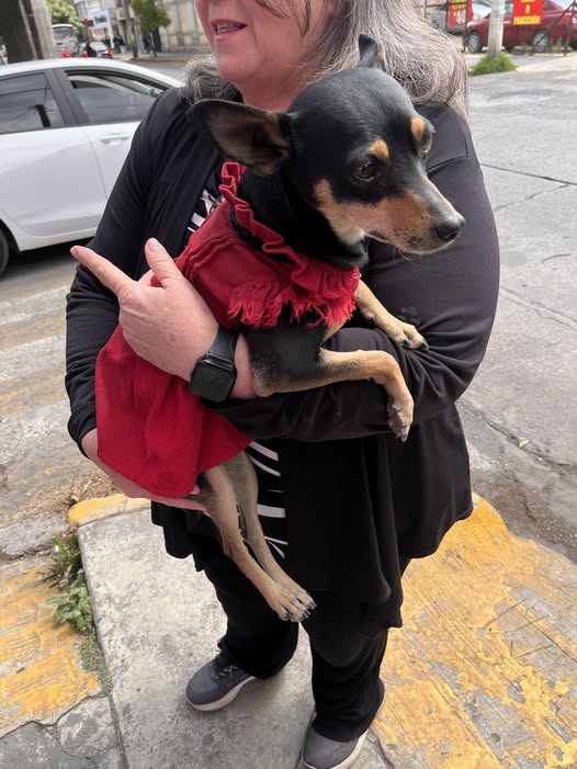 Se ha visto a una perrita con un vestido rojo en el centro de Toluca. Ella se encuentra resguardada en la Cafetería Sofía, ubicada en la esquina del Instituto Literario con Galeana. Si alguien la está buscando, por favor acérquense.