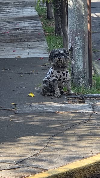 Hoy encontramos a este perrito en la calle Fortuna Nacional, esquina con Viento Suave, en la colonia San Antonio, Azcapotzalco. Es un schnauzer que lleva un suéter blanco con bolitas negras. Parece que ha estado perdido un tiempo, ya que su pelo está largo. Lamentablemente, no pude resguardarlo porque no se dejó agarrar, pero le dejé comida. Espero que sus dueños aparezcan pronto. 🙏🏿