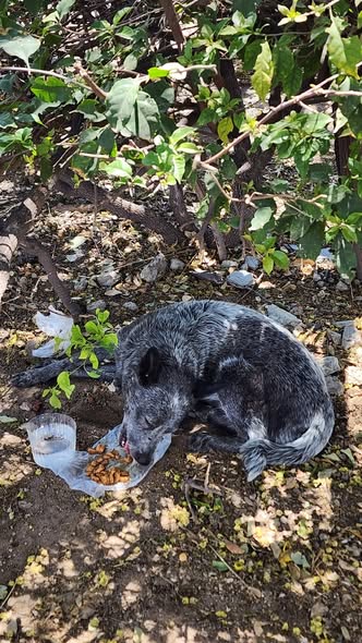 Hoy encontré a esta perrita, parece que tiene una herida en una patita. La vi frente al Banamex de Avenida de la Luz. Ya tengo que irme, pero le dejé comida y agua.