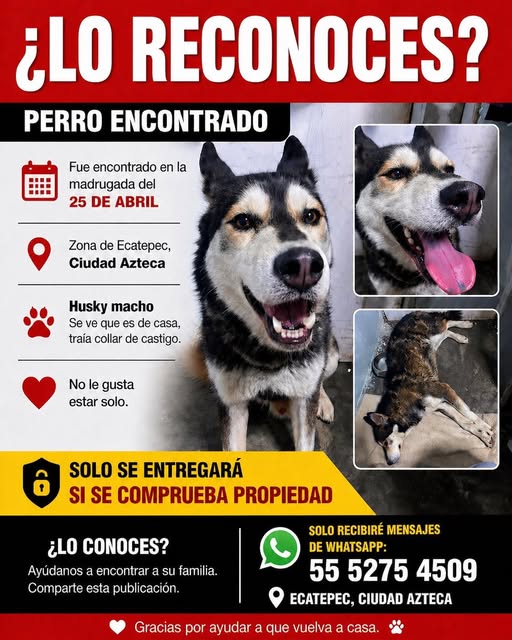 🚨 ¿LO RECONOCES? HUSKY EN CIUDAD AZTECA 🚨 Este perrito fue encontrado en la madrugada del 25 de abril en Ciudad Azteca, Ecatepec. 🐺 Es un husky 🏡 Claramente es un perro de casa (es sociable, tranquilo y busca compañía) ⚠️ Llevaba un collar y no le gusta estar solo. Actualmente está resguardado, pero necesitamos encontrar a su familia lo antes posible 💔 👉 Solo se entregará a quien pueda demostrar que es su dueño. 📲 Para informes, comuníquese únicamente por WhatsApp al: 5552754509 🙏 AYÚDAME COMPARTIENDO para que llegue a su familia.