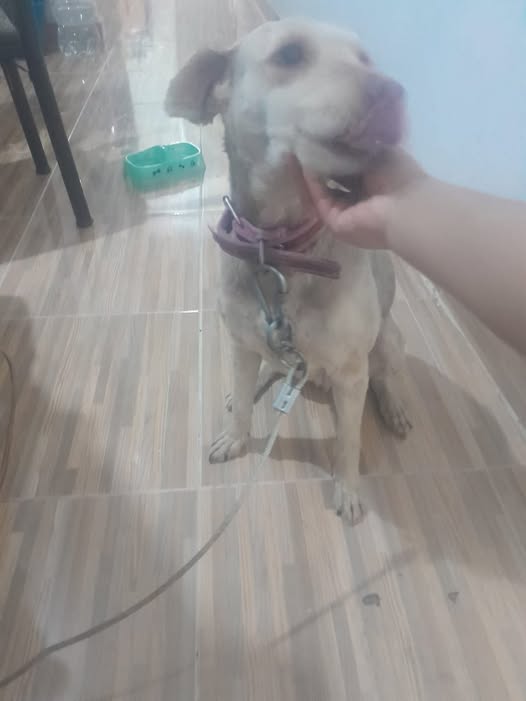 Hola, encontré a este perro vagando en la Avenida Central, cerca de la colonia Sauces y Nueva Aragón. No tiene nombre ni placa con información. Lleva un collar rosa y una correa. Si es tu perro, por favor comunícate para poder entregarlo.