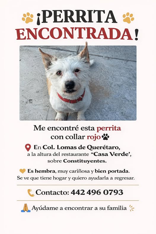 🔴¡Hola! Encontré a esta perrita con collar. Si alguien sabe si la están buscando, por favor contáctenme al 4424960793. 🔴 La encontré el 19 de marzo de 2026, sobre Constituyentes, cerca del restaurante "Casa Verde", en la Colonia Lomás de Querétaro. Es muy noble y cariñosa.