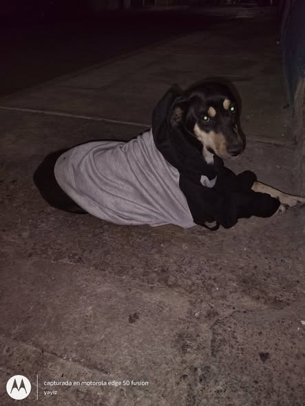 Buenas noches. Si esta perrita es de alguien, se encuentra en la calle 9 entre la sexta y sΓ©ptima avenida de la colonia El Sol. No puedo llevarla a mi casa porque no tengo espacio, solo le pusimos esa sudadera. π