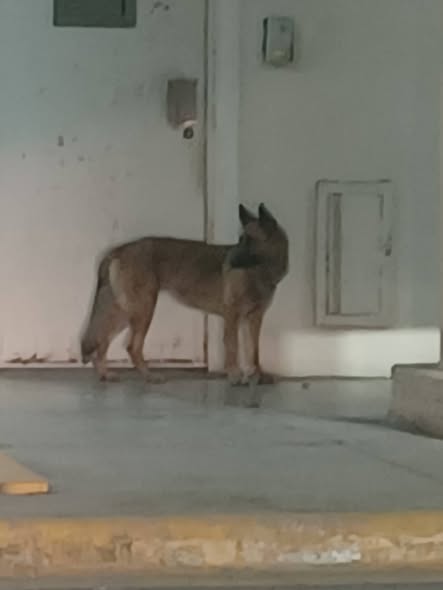 Se encuentra en el HB Moll de Pablo Livas. Según el guardia, lleva 3 días aquí. Es una perrita muy buena, similar a un pastor alemán o belga.