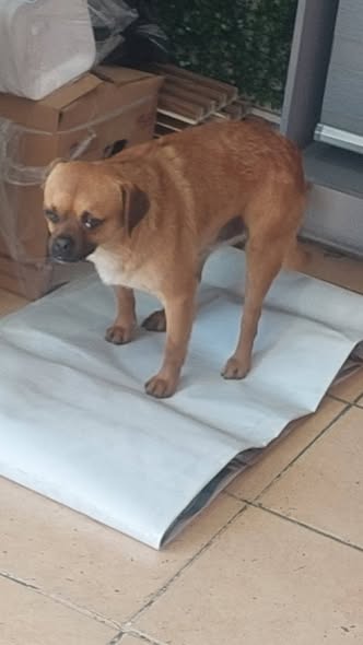 Actualización: El perrito sigue conmigo en mi lugar de trabajo, pero no quiere comer ni beber agua. Parece que tiene algo entre sus patas, aunque no logro identificarlo. Hasta ahora, nadie ha reclamado al perrito. Lamentablemente, no puedo llevarlo a casa porque mi arrendador no permite mascotas. Estaré aquí hasta las 7 p.m. en Acueducto esquina Caballerizas. Si nadie lo reclama, lo llevaré al terreno de enfrente.