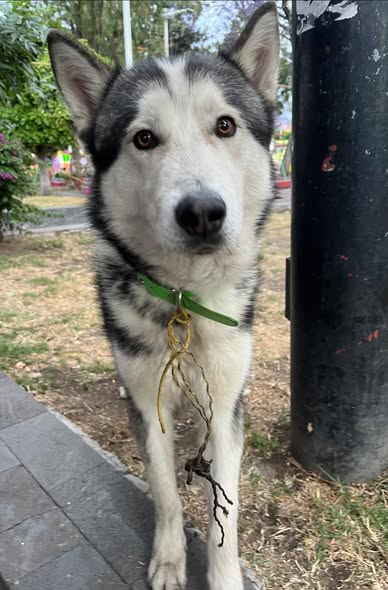 Este perrito parece estar perdido. Se encuentra en el parque Tláhuac, cerca de la Parroquia de San Pedro Apóstol. No se deja atrapar y lleva un collar verde.