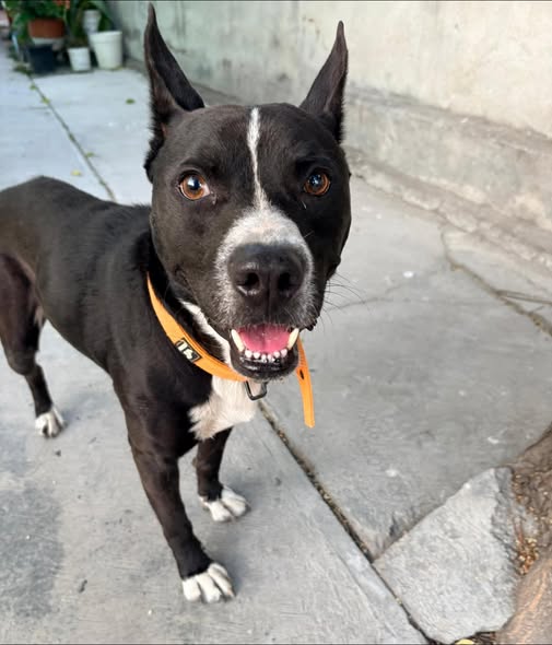 Hoy por la mañana, encontramos a un perrito afuera de nuestra casa. Lleva un collar naranja, pero no tiene placa de identificación. Se encuentra en la zona de La Pastora, en Guadalupe.