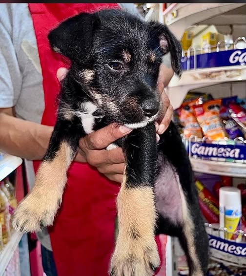 Se ofrece en adopción un cachorrito de aproximadamente dos meses. Este pequeño fue rescatado de una situación difícil en la calle. Parece ser de tipo chihuahua o pinscher. Si estás interesado o necesitas más información, no dudes en contactarme. 🐶