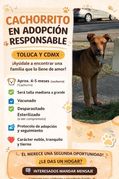 🐾✨ CACHORRITO EN ADOPCIÓN RESPONSABLE ✨🐾 📍 Toluca / CDMX Este adorable cachorrito fue rescatado de la calle y está en busca de una familia que lo ame para siempre. 🥺💛 Tiene aproximadamente 4–5 meses, es muy noble, tranquilo y cariñoso. Es de esos que solo necesitan una oportunidad para convertirse en el mejor compañero. 🐶 🦴 Información sobre él: • Edad: 4–5 meses • Tamaño: será mediano a grande • Carácter: noble, tranquilo y muy cariñoso 💉 Se entrega: ✔ Vacunado ✔ Desparasitado ✔ Esterilizado (o con compromiso) 📋 Proceso de adopción responsable: Realizamos un protocolo de adopción (cuestionario, entrevista y seguimiento), ya que buscamos un hogar real y definitivo. 🏡 🙏 Buscamos una familia que lo integre como parte de su vida, lo cuide y le brinde el amor que merece. ✨ Dale una segunda oportunidad… no te arrepentirás. ✨ 📩 Si estás interesado, por favor envía un mensaje.