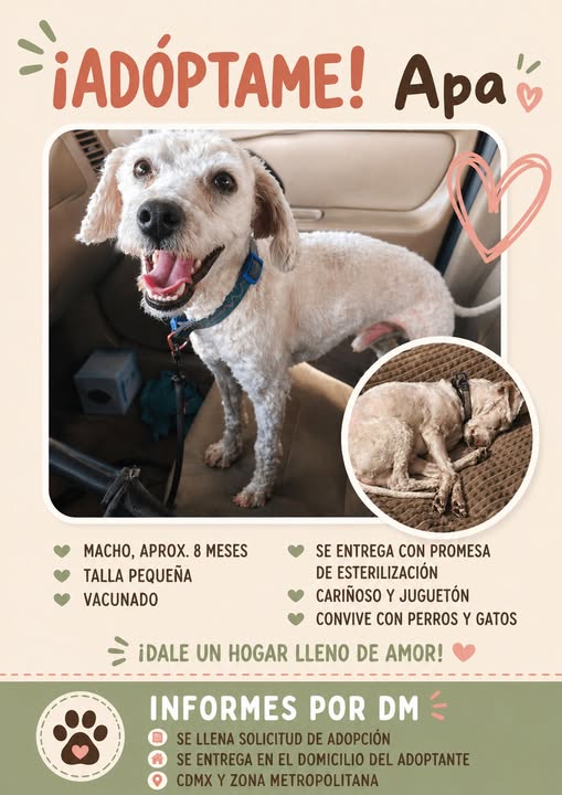 🏡 Busco una familia para Apa, un perrito joven que fue rescatado de un accidente en Av. Constituyentes. Si estás interesado en adoptarlo, ten en cuenta lo siguiente: • Paciencia: Es importante educarlo y enseñarle lo que significa ser parte de una familia. • Compromiso: Debe vivir en interiores (no en patios ni azoteas). • Tiempo: Necesita momentos para jugar y explorar el mundo. Si no puedes adoptarlo, por favor, ayúdame a difundir esta información.