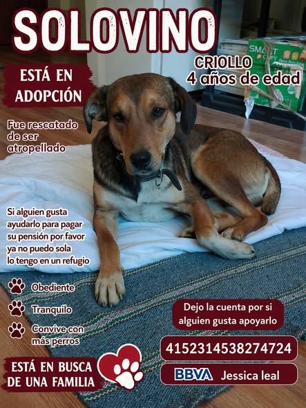 Solicito su amable ayuda para encontrar un hogar para Solovino. No quiero que regrese a las calles y sufra maltrato. Adjunto fotos del pequeño. Es urgente encontrarle un hogar, ya que no puedo cubrir los gastos del refugio sola. ¡Gracias!