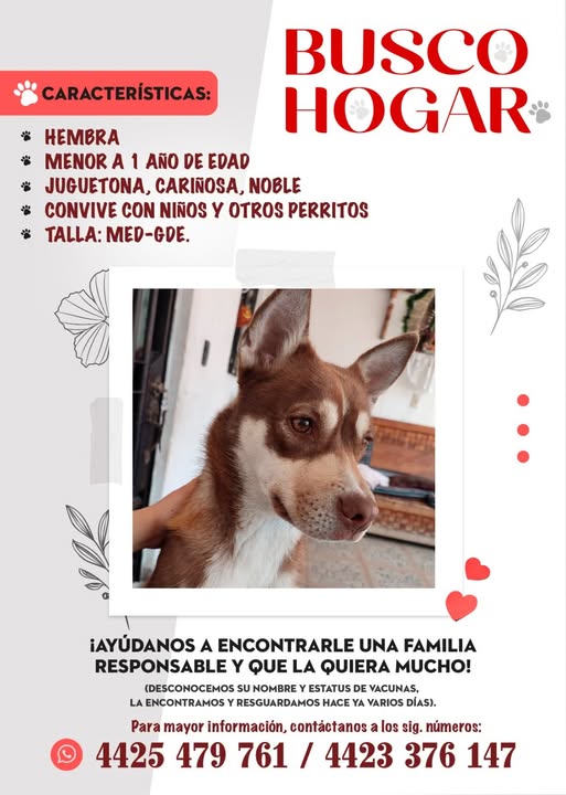 ¡Hola a todos! Les pedimos su ayuda para encontrar un hogar para esta hermosa perrita. Es muy cariñosa y dulce, ideal para personas responsables que la quieran mucho. Es juguetona y siempre agradecida. Si estás interesado, por favor contáctanos a los siguientes números: 4425479761 / 4423376147. Muchas gracias de antemano. 🙏🏻