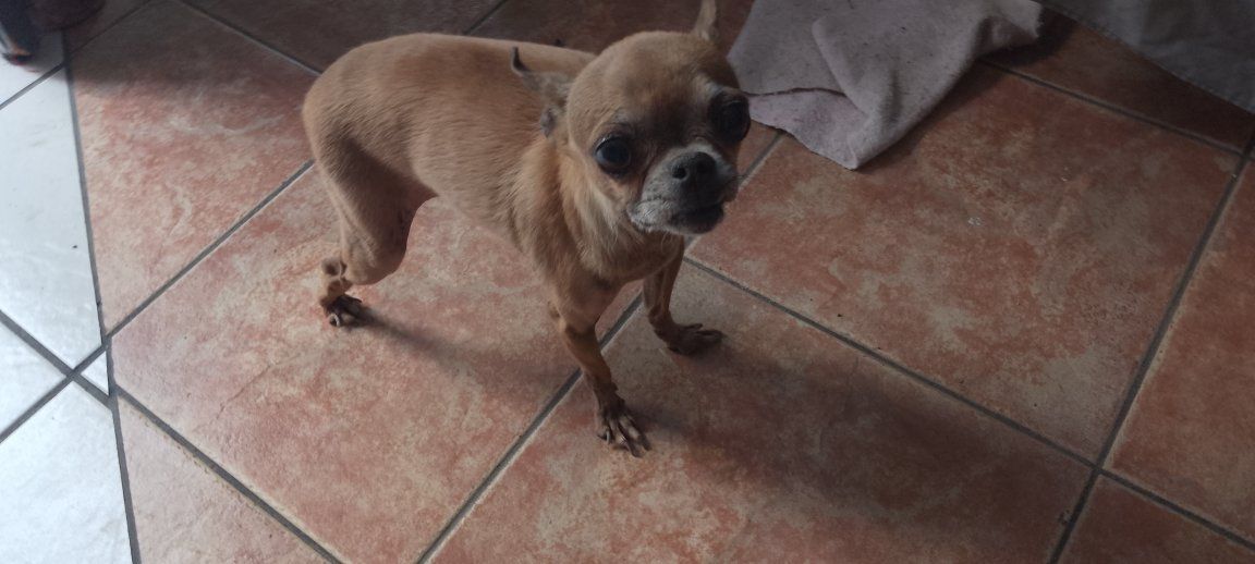 Esta perrita con una pata trasera rota está buscando un hogar permanente. Si estás interesado en adoptarla, por favor contáctanos. Ella se encuentra en la calle.