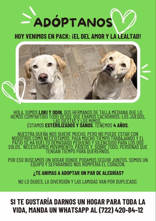 Estos adorables perros siguen en busca de una familia. Son muy tranquilos, no pelean por la comida y saben realizar trucos como sentarse, acostarse, girar y pararse en dos patas. Pueden esperar pacientemente a que les sirvas su comida, solo necesitas indicarles con dos aplausos. Siempre han vivido en el patio, pero disfrutan explorar cuando salen a pasear. Se quieren mucho entre ellos y también pueden brindarte mucho cariño a ti. Si estás interesado en adoptarlos o conoces a alguien que lo esté, por favor envía un mensaje por WhatsApp al número que aparece en el cartel o comenta en esta publicación para ponerte en contacto con su dueña. Te agradeceríamos mucho si compartes esta publicación 🐕🐕🙏🏼🙏🏼. Su dueña está dispuesta a llevarlos a su nuevo hogar si vives en la zona del valle de Toluca (desde Ocoyoacac hasta Zinacantepec).