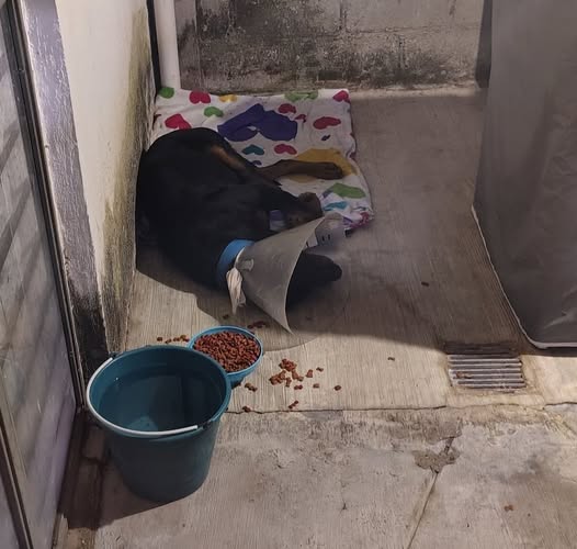 ¡SE DA EN ADOPCIÓN! Hace unos días, este perrito llegó a mi casa. Tenía una soga amarrada muy apretada que le quité, le di de comer y se quedó afuera. Le hice una pequeña casita improvisada, pero no he podido encontrar a su dueño. Es un perro muy noble, aunque grande. Es tranquilo, pero territorial. Recientemente, tuvo un altercado con otros perros y le lastimaron las orejas. Lo he estado curando y actualmente le estoy dando antibióticos, por lo que lleva un cono en la cabeza. Lamentablemente, no puedo quedármelo, ya que tengo tres chihuahuas en casa que son peleoneros y territoriales. Mi hogar es pequeño y no tengo cochera. Además, los perros grandes de los vecinos lo han atacado varias veces en la calle. ¡Por favor! Si alguien tiene un buen espacio o un albergue que pueda acogerlo, yo puedo ayudar con los gastos. Es urgente encontrarle un nuevo hogar, ya que está en un patio pequeño y se ve triste, pero no puedo sacarlo ni tenerlo dentro de mi casa. Si alguien puede ofrecerle una mejor vida, de verdad es un perrito muy noble y bonito, yo le llamo 'negrito'. ¡Muchas gracias por su atención!