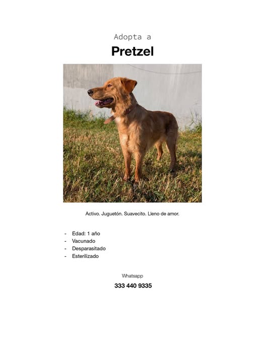 Continuamos en la búsqueda de un hogar para Pretzel. Te agradeceríamos mucho si pudieras compartir esta información con alguien que pueda ayudar. Contacto por WhatsApp: 3334409335