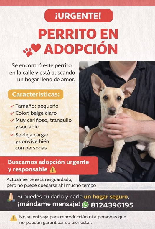🚨 ¡TOTOPO BUSCA HOGAR! 🐶💛 PERRITO MACHO ENCONTRADO – ADOPCIÓN URGENTE He encontrado a este perrito en la calle, cerca del Soriana que está junto a la UDEM, en Av. Alfonso Reyes. Actualmente está resguardado, pero no puedo tenerlo por mucho tiempo 😞 Es un perrito muy noble, cariñoso y tranquilo. Le encanta estar con las personas, busca compañía y atención, y se lleva muy bien con otros perritos 🐕🤍. Además, se deja cargar sin problema. Estamos buscando una adopción responsable y URGENTE, alguien que realmente pueda darle el hogar que se merece. Si tú o alguien que conozcas puede adoptarlo, por favor envíame un mensaje 📲 WhatsApp: 8124396195 🙏 Te agradecería mucho si compartes esta publicación para que llegue a más personas y pueda encontrar una familia lo antes posible.