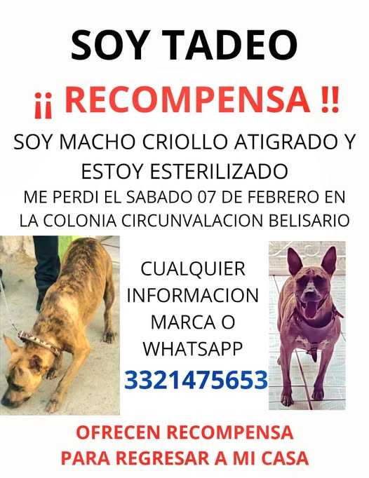 ¡Hola! Si has visto a Tadeo, por favor, ayúdame a encontrarlo. Es un perro de compañía para un adulto mayor y agradecería mucho tu ayuda. Ofrezco una recompensa al momento de entregarlo. ¡Gracias! 🙏