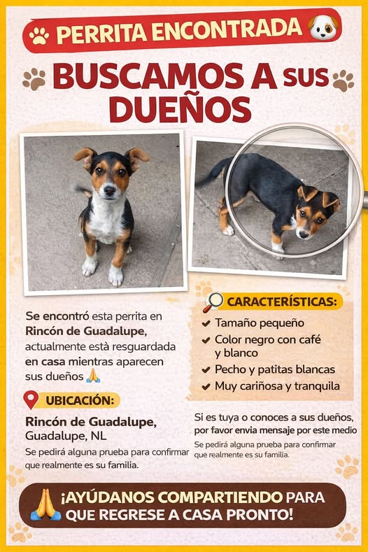 🐶 A SUS DUEÑOS: PERRITA ENCONTRADA – ¡BUSCAMOS A SU FAMILIA! 🐶 Se encontró esta perrita en Rincón de Guadalupe, en la misma colonia donde fue hallada. Actualmente está resguardada en casa mientras esperamos que aparezcan sus dueños. 🙏 🔎 Características: • Tamaño pequeño • Color negro con café y blanco • Pecho y patitas blancas • Muy cariñosa y tranquila 📍 Ubicación: Rincón de Guadalupe, Guadalupe, NL Si es tuya o conoces a sus dueños, por favor envía un mensaje por este medio. 📩 🙏 Ayúdanos compartiendo para que regrese a casa pronto.