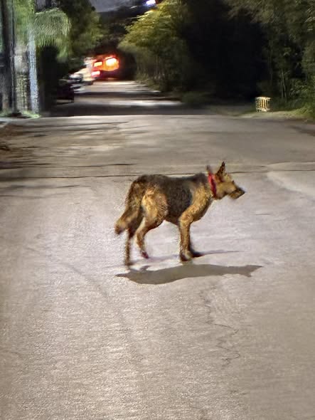 Hoy encontré un perrito muy tímido que llevaba un collar rojo. Estaba un poco mojado y con frío. Es de tamaño grande y parece un Pastor Alemán. No pude acercarme a él porque se asustó y se fue rápidamente. Fue visto en Arroyo la Talaverna, entre la calle de la Vereda y Del Altillo.