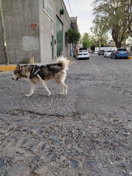 Se ha avistado un husky grisáceo en la Plazita Juárez, antes de llegar al cerro de la reina. Lleva una pechera negra con la inscripción "police k9". El perro no parecía desubicado, se mostraba muy tranquilo.