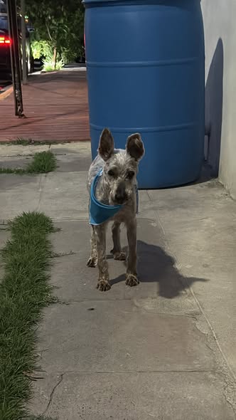 ¡Hola a todos! Encontré un perrito en la calle Miguel de Cervantes. Se ve un poco viejito y lleva un pañuelo celeste/azul. Está limpio, pero parece que no puede ver ni escuchar bien. Por favor, ayúdenme a compartir esta publicación para que pueda regresar con su familia. ¡Gracias!