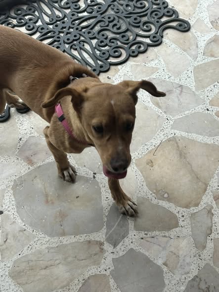 He encontrado a esta perrita en la calle Pedro García Conde, en la colonia 5 de Mayo. Parece ser de casa, ya que lleva su pechera y está muy asustada. La tengo resguardada en mi local.
