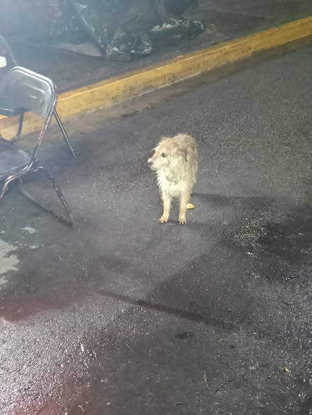 Este perrito necesita ayuda. Está mojado y lleva un collar verde con huellas. Se encuentra en la Avenida Uxmal, frente al SMUMM. Si alguien lo reconoce, por favor, contáctenos.